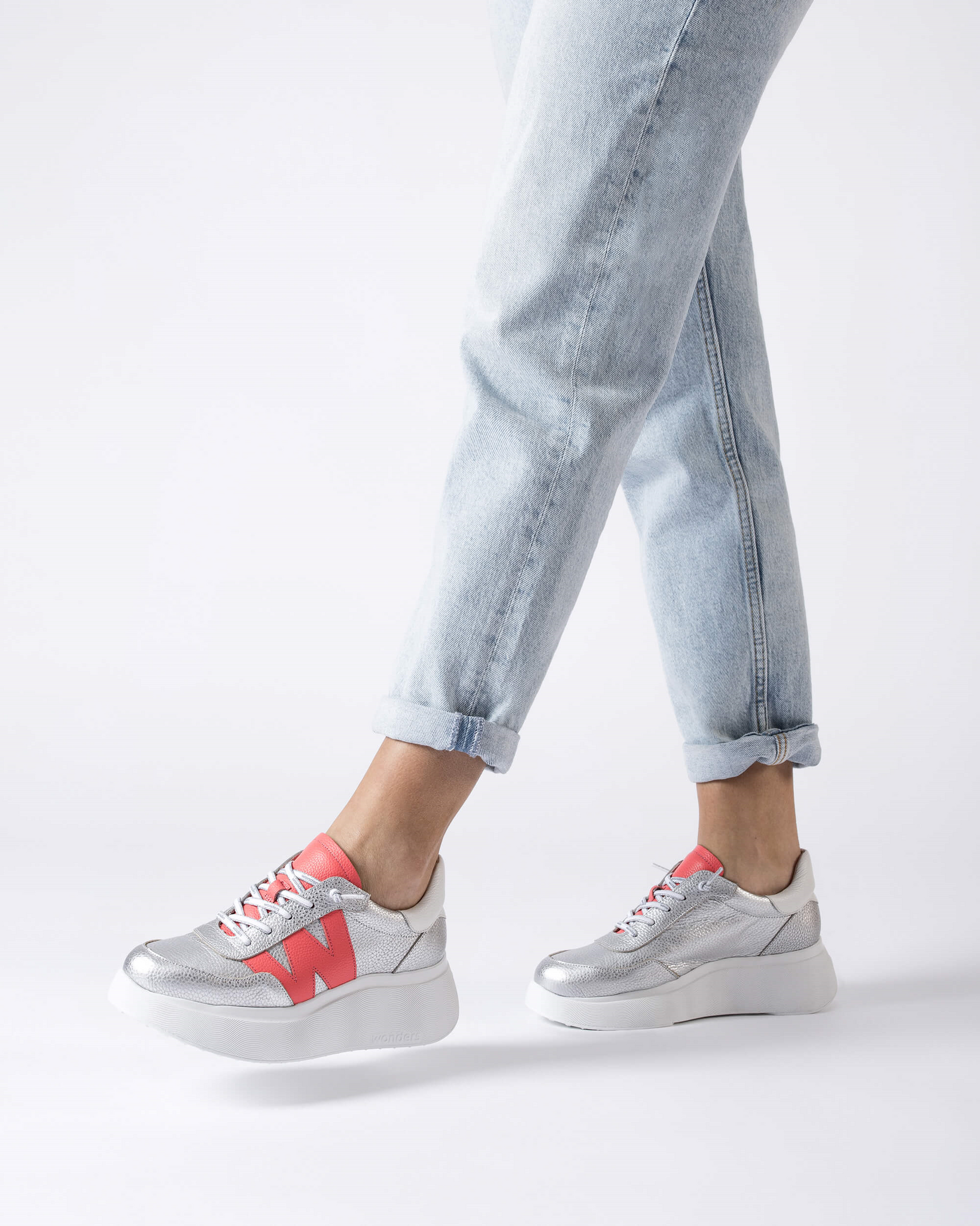 Wonders | Elastic Lace Wedge Trainers in Silver & Coral | A-3625