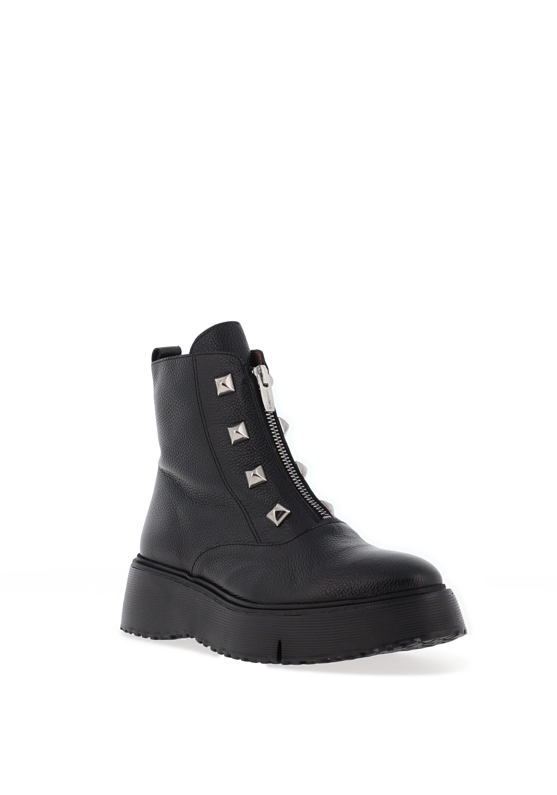 Wonders | Studded Front Zip Wedge Ankle Boots in Black Leather | A-9301 Negro